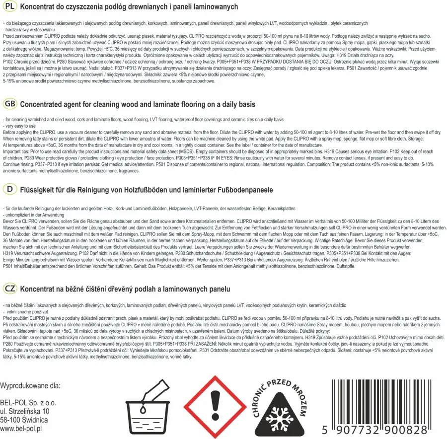 CLIPRO rozcieńczyć z wodą w proporcji 50-100 ml płynu na 8-10 litrów wody.